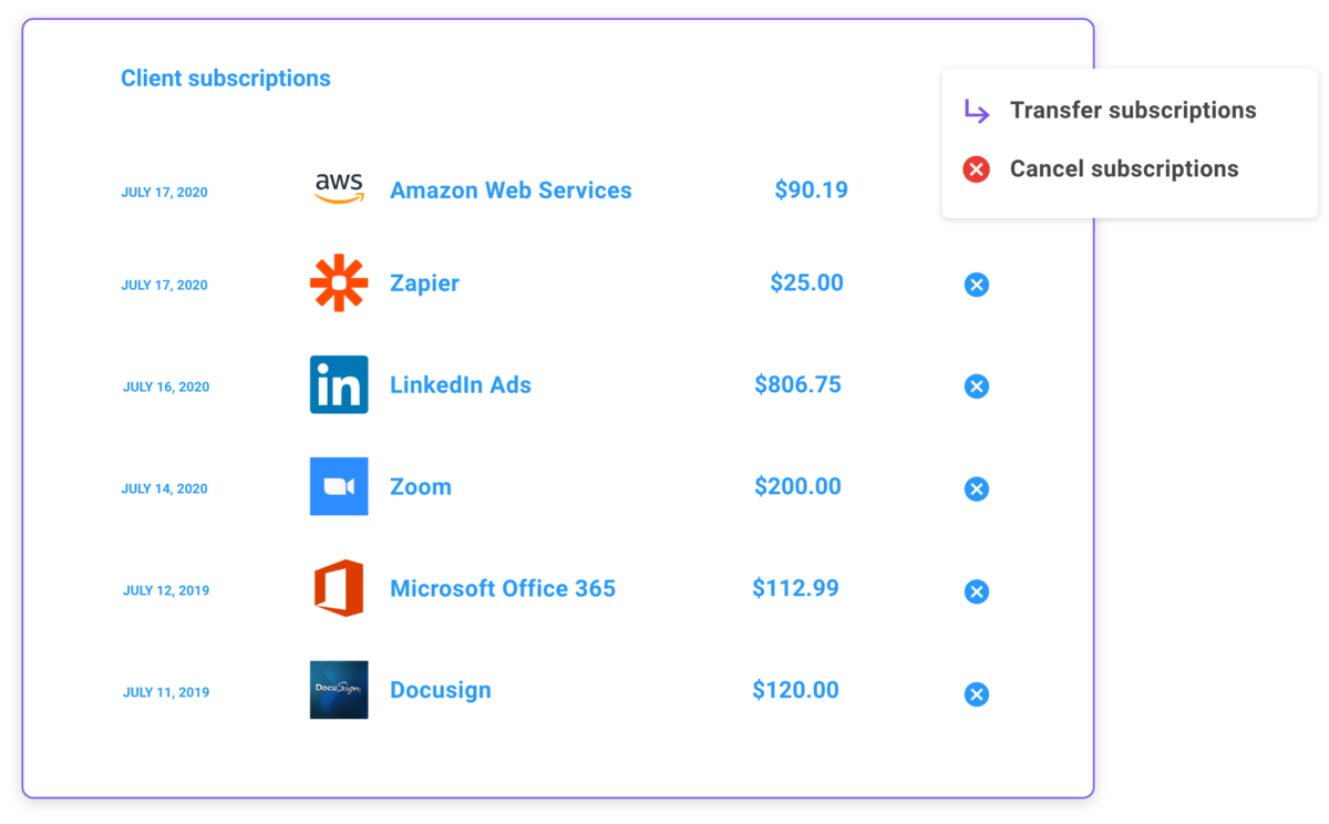 Clients fund the cards. Buy subscriptions with virtual credit cards funded by your clients, so you’re not stuck in the middle of their billing.