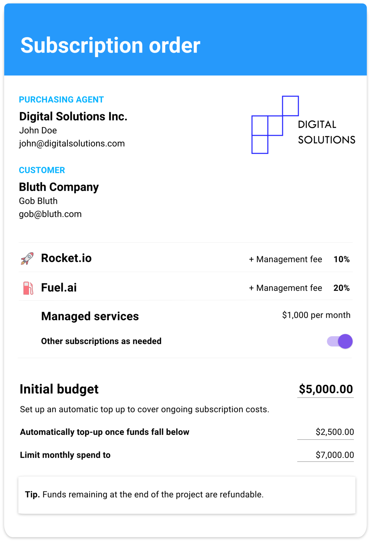 Quickly onboard and enable agency, SI, service and implementation partners to manage purchases to subscriptions of your software on behalf of their customers without putting the partner in financial risk. AppBind automatically bills the end customer and ensures customers always own their subscriptions.